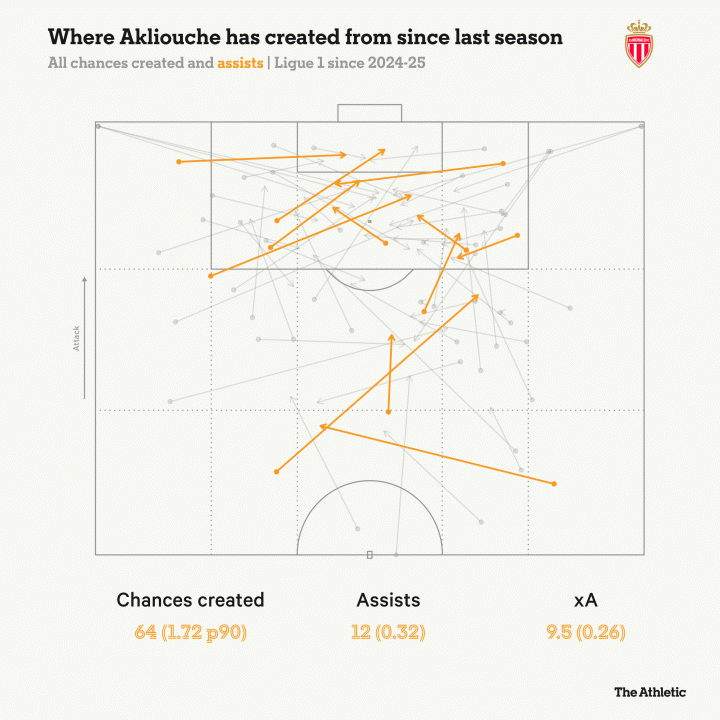 作為摩納哥進(jìn)攻體系的核心創(chuàng)造者,阿克利烏什自上賽季以來已貢獻(xiàn)12次助攻,與法甲聯(lián)賽助攻榜首位持平。雖然名義上擔(dān)任右邊鋒,但其活動(dòng)范圍覆蓋整個(gè)進(jìn)攻三區(qū),從機(jī)會(huì)創(chuàng)造和助攻分布來看,左右兩翼的威脅制造能力相當(dāng)均衡。