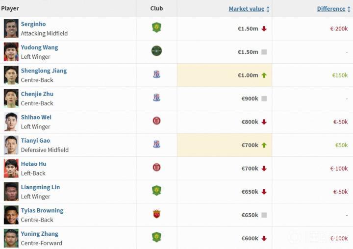 中超國(guó)內(nèi)球員身價(jià)TOP10重磅揭曉(單位:歐元)